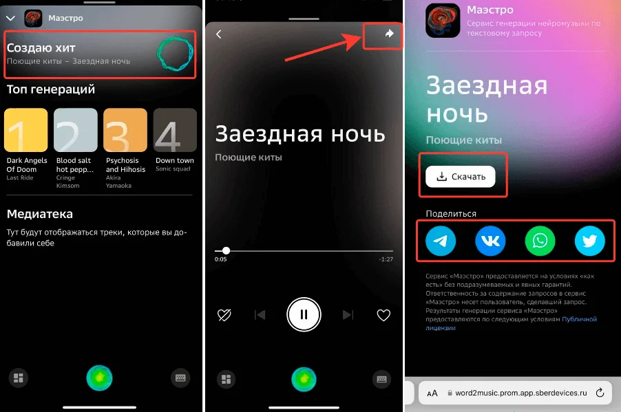 Когда трек будет готов, им можно поделиться в социальных сетях. Либо скачать — для этого нужно нажать на стрелочку рядом с треком, и тогда система предложит покинуть приложение Сбера, чтобы скачать мелодию или поделиться ею.