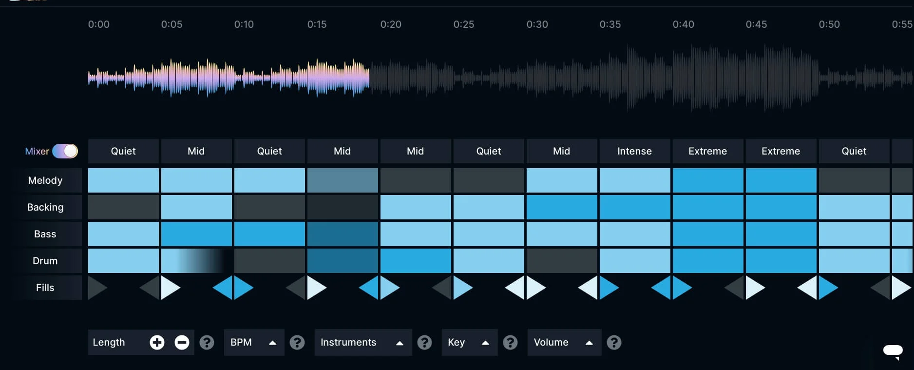 Сервис позволяет создавать мелодии любого жанра. В Soundraw можно выбрать длительность (от 10 секунд до 5 минут), музыкальный стиль, настроение и темп. Есть встроенный микшер, который позволяет менять настройки сгенерированной композиции.