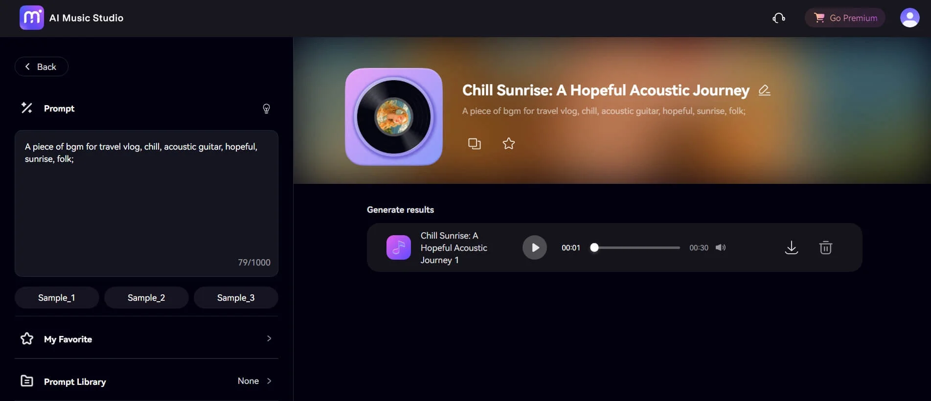 Medio.io — универсальный редактор и генератор аудио. Генерация музыки ограничена по параметрам: можно выбрать только жанр музыки, настроение и тему. Либо создать трек по текстовому описанию.