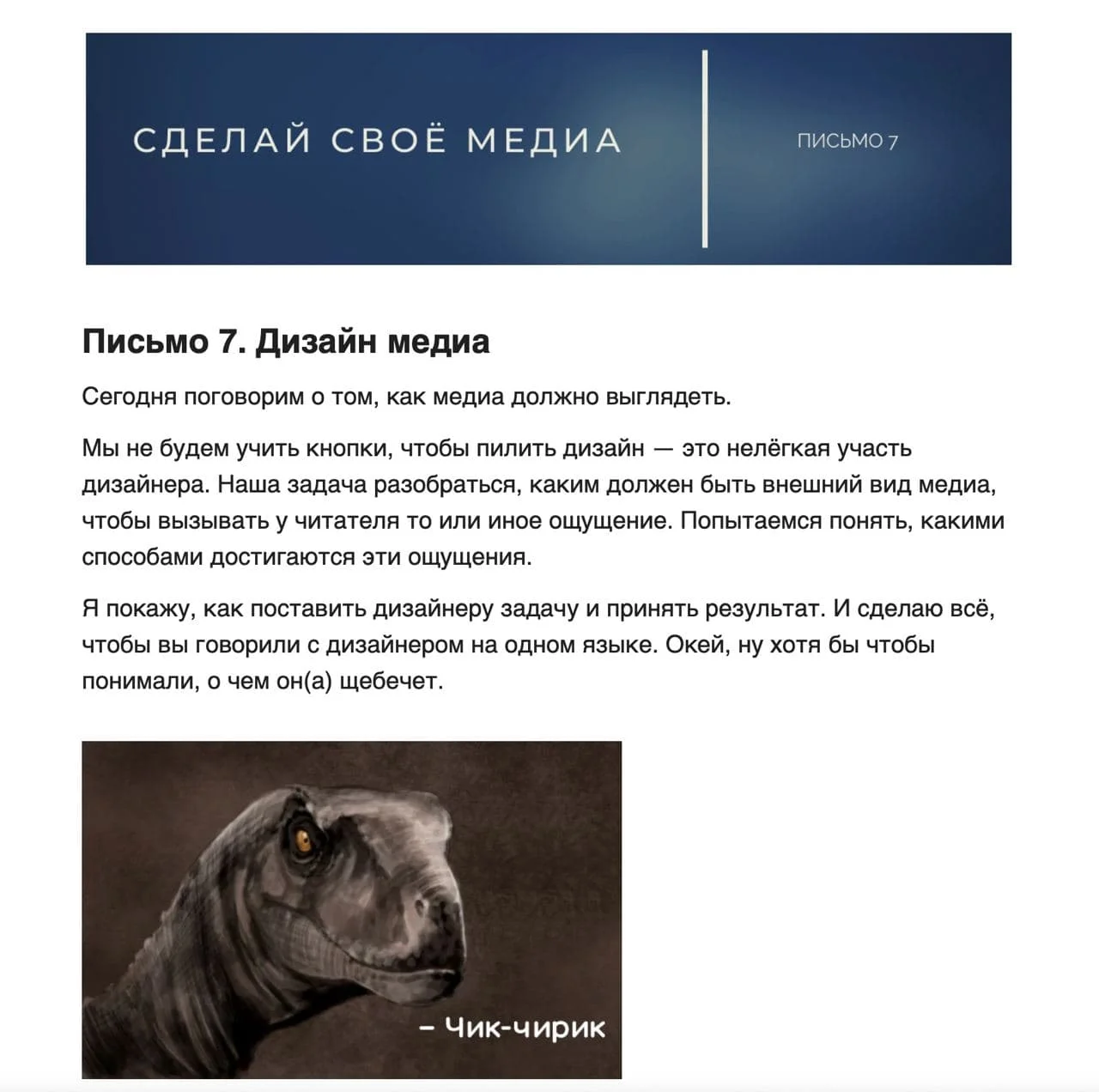 Количество визуала зависит от темы. Например, письмо про дизайн на две трети состоит из скриншотов страниц разных медиа. А вот в первых письмах визуала практически не было, поэтому появилось моё альтер-эго — динозаврик. Он в нужных местах вступает со мной в дискуссию, здоровается с читателем и всячески проявляет самостоятельность. Такой чисто драматургический приём.