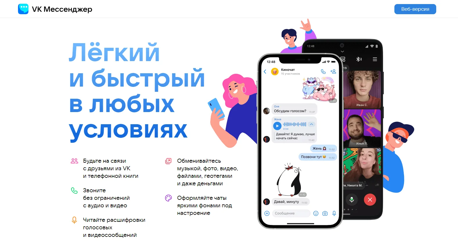VK Мессенджер — приложение от социальной сети ВКонтакте. Как и в обычных диалогах ВКонтакте, здесь можно создавать чаты, обмениваться вложениями, отправлять стикеры и аудиосообщения. Но главная задача сервиса — создать фокус на общении, без отвлечения на ленту, музыку или видео.