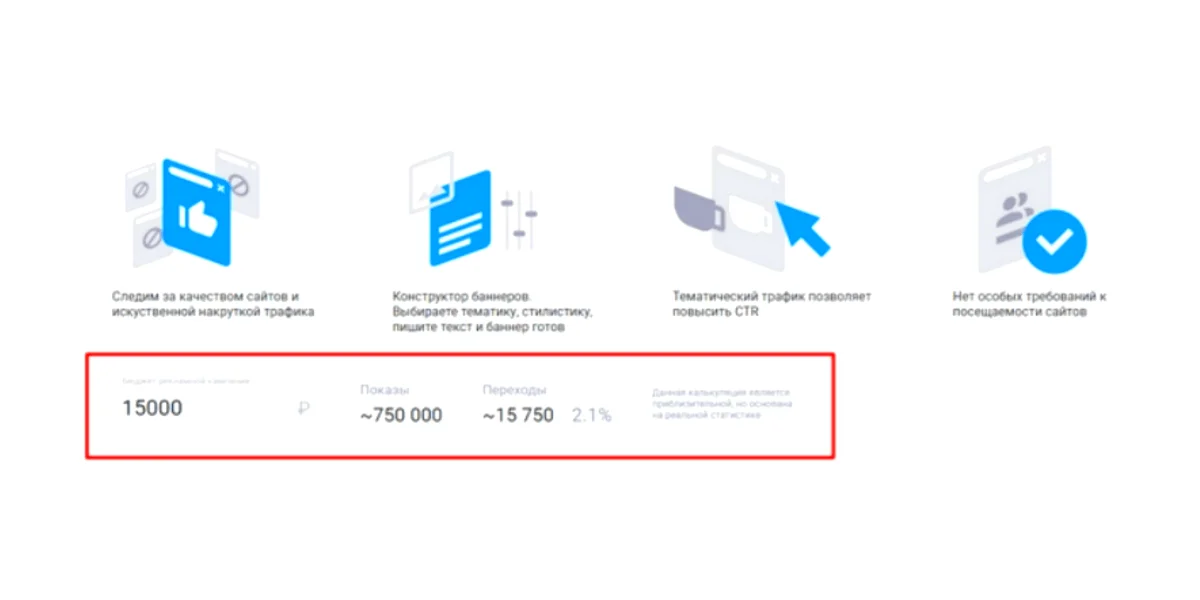 Стоимость. На сайте есть калькулятор для удобства расчетов на конкретный бюджет. В среднем цена клика — от 5 рублей.