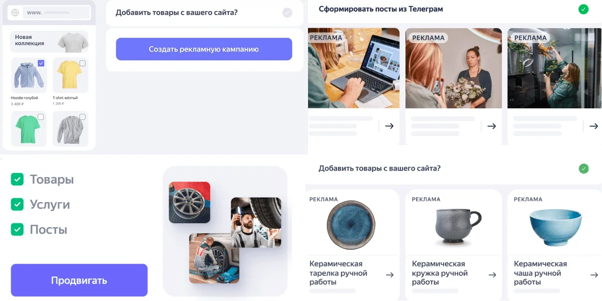 Другой важный блок Яндекс Бизнес относится к рекламе товаров, которые размещены на разных ресурсах. Например, можно рекламировать: