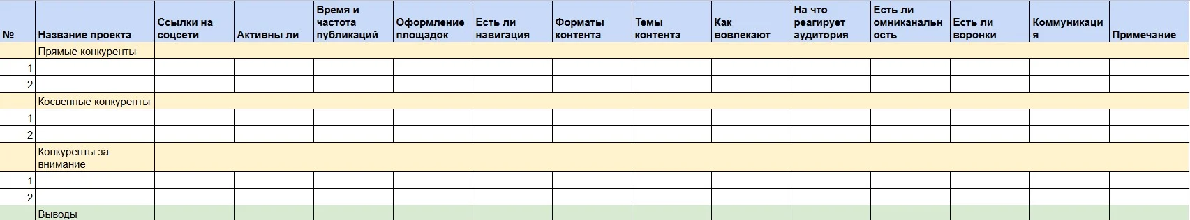 Конкурентов удобно фиксировать в отдельной таблице по подразделам: прямые конкуренты, косвенные и конкуренты за внимание. Рядом с названием каждого стоит указать ссылки на социальные сети, чтобы не тратить время на поиск и сразу начать анализ по основным параметрам. Таблица может выглядеть так: