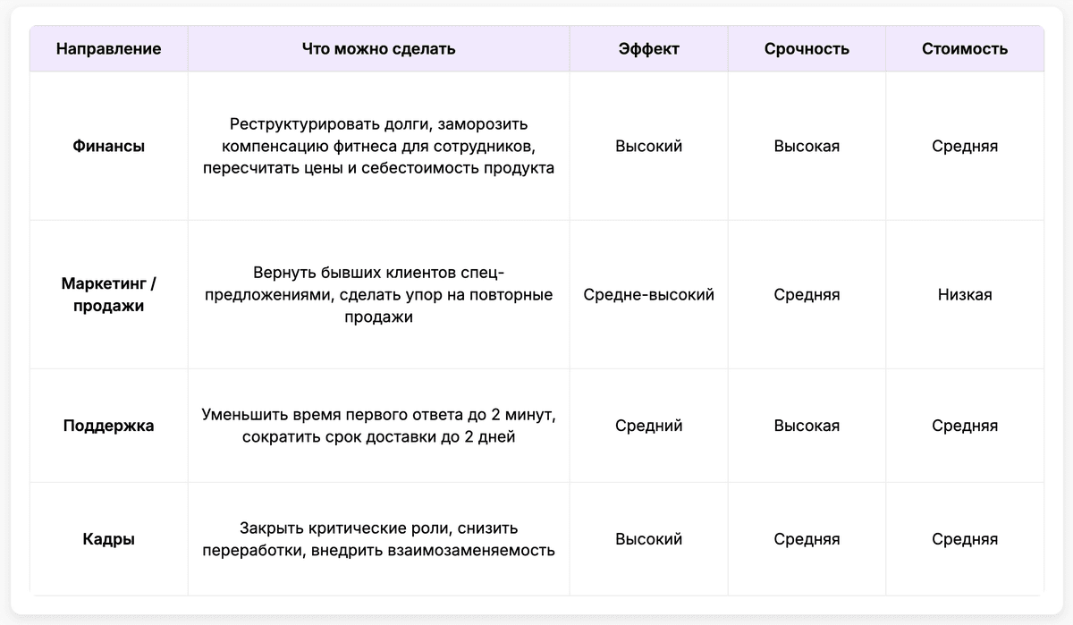 Шаг 7. Построение антикризисной стратегии. Когда понятны причины кризиса и ясно, как с ними можно побороться, нужно собрать план на 4–12 недель. Такой документ помещается на 1–2 страницах и отвечает на вопросы: