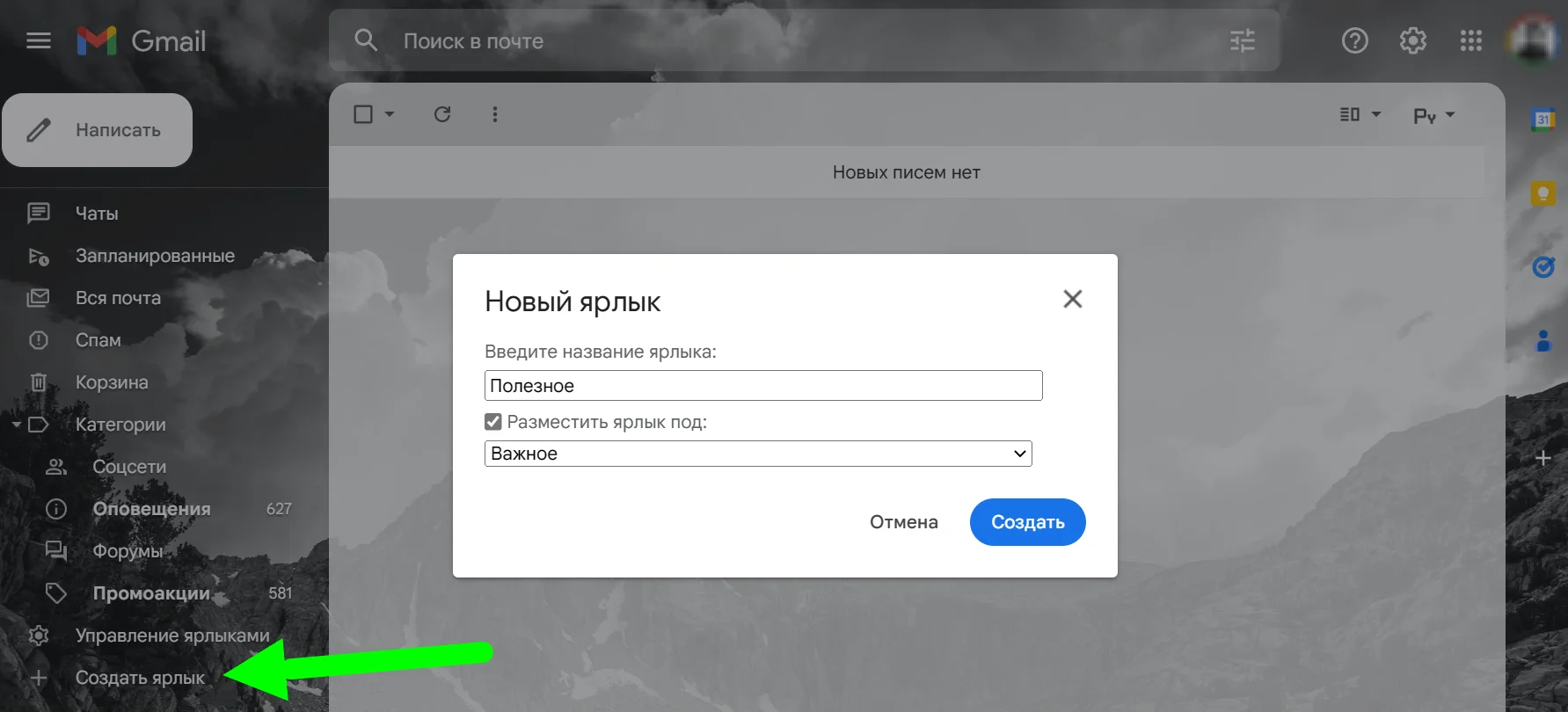 Чтобы создать новую папку, нужно присвоить ей ярлык. Разверните меню почты и кликните на пункт «Создать ярлык». В открывшемся окне напишите название новой папки. Также можно указать родительский элемент — раздел, под которым будет размещена созданная папка.