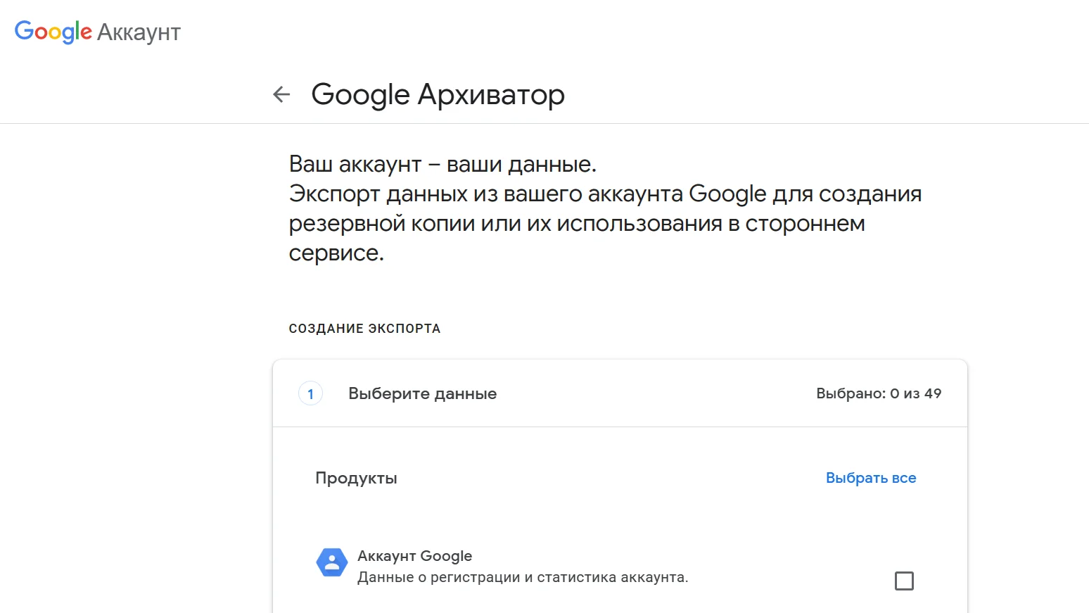 Если вы всё-таки переживаете, что в почтовом ящике нужные сообщения затеряются, то вы можете скачать письма на свой компьютер. Для этого откройте сервис «Google Архиватор». Здесь можно экспортировать любые данные из Google-аккаунта, чтобы создать резервную копию или использовать их в стороннем сервисе.