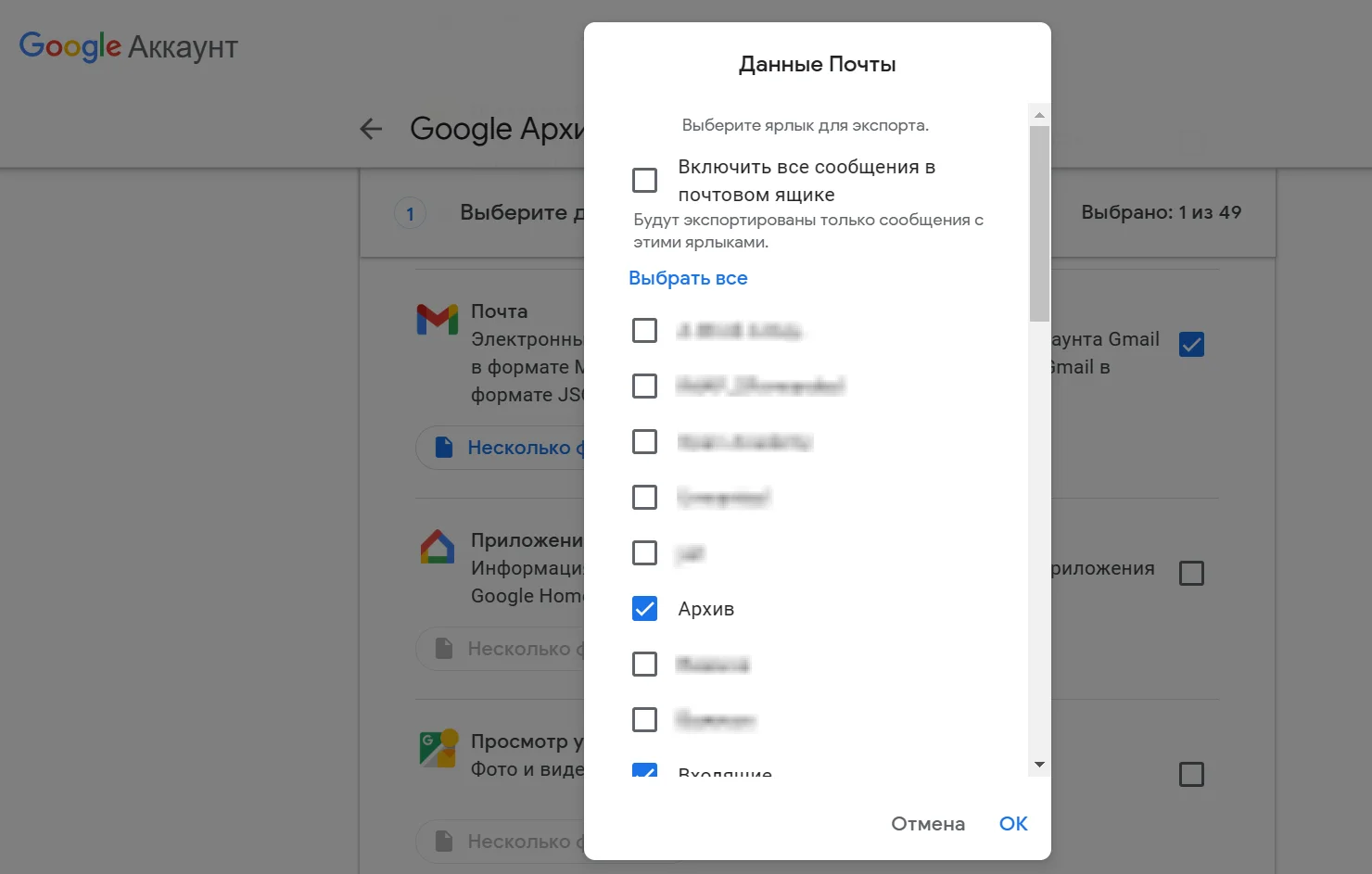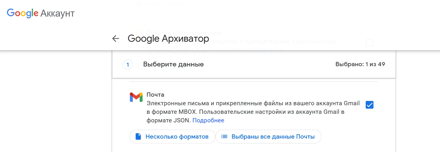 По умолчанию Google готов выгрузить всё, что есть в ящике. Если нажать на «Выбраны все данные Почты», то можно отметить только нужные папки для скачивания.