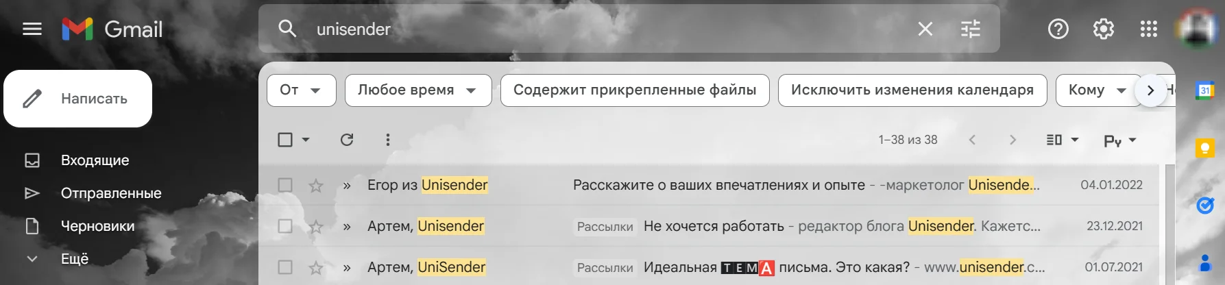 Например, вот так выглядит поиск по отправителю. Вариант удобен, если нужно найти письма из какой-то рассылки, от конкретной компании или человека: