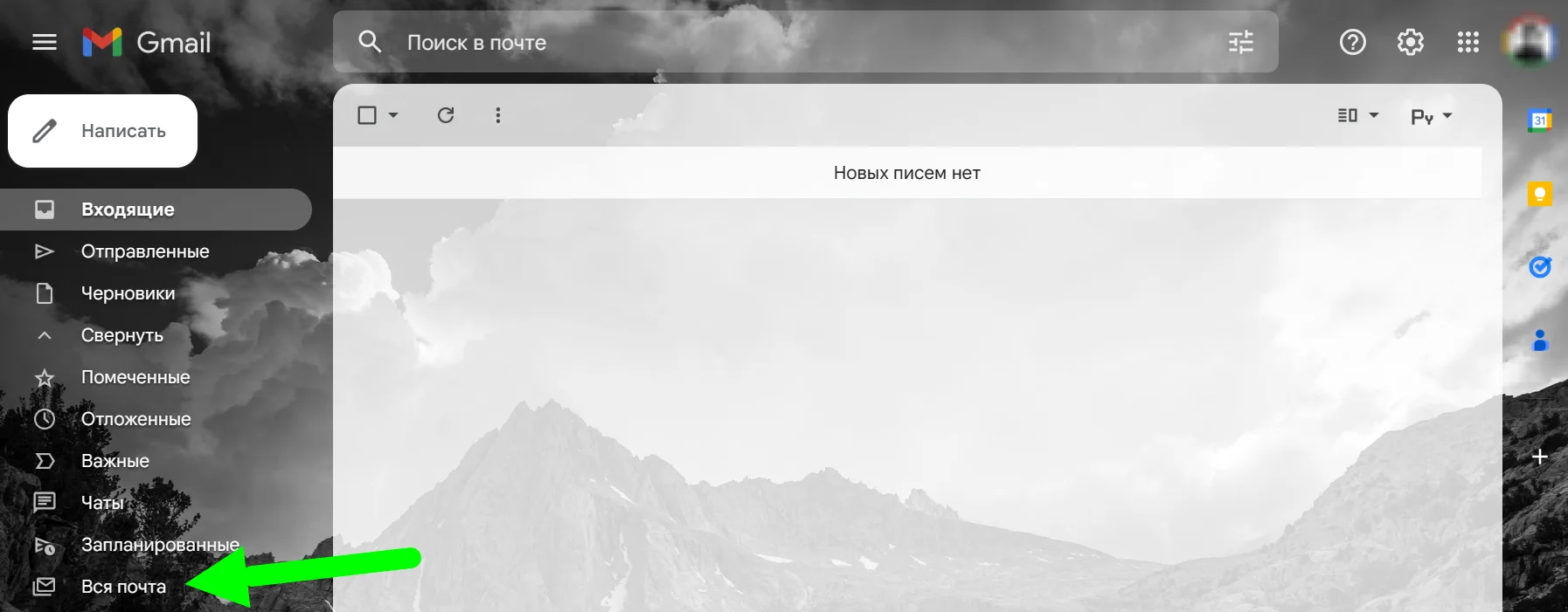 Для поиска сообщений в папке «Вся почта»: откройте почтовый ящик → нажмите на «Ещё», чтобы развернуть меню → кликните на «Вся почта».