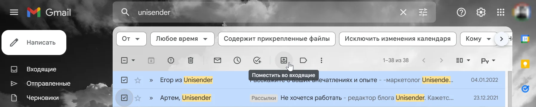 Чтобы вернуть письмо из архива во входящие, поставьте флажок возле нужного сообщения и кликните по кнопке «Переместить во входящие».