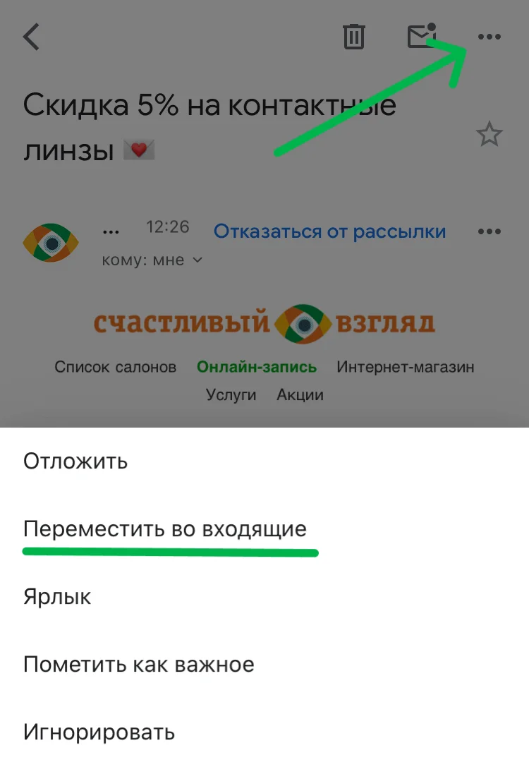 Чтобы перенести письмо из архива во входящие, откройте найденное сообщение. Затем нажмите на троеточие в правом верхнем углу и в открывшемся меню выберите «Переместить во входящие».