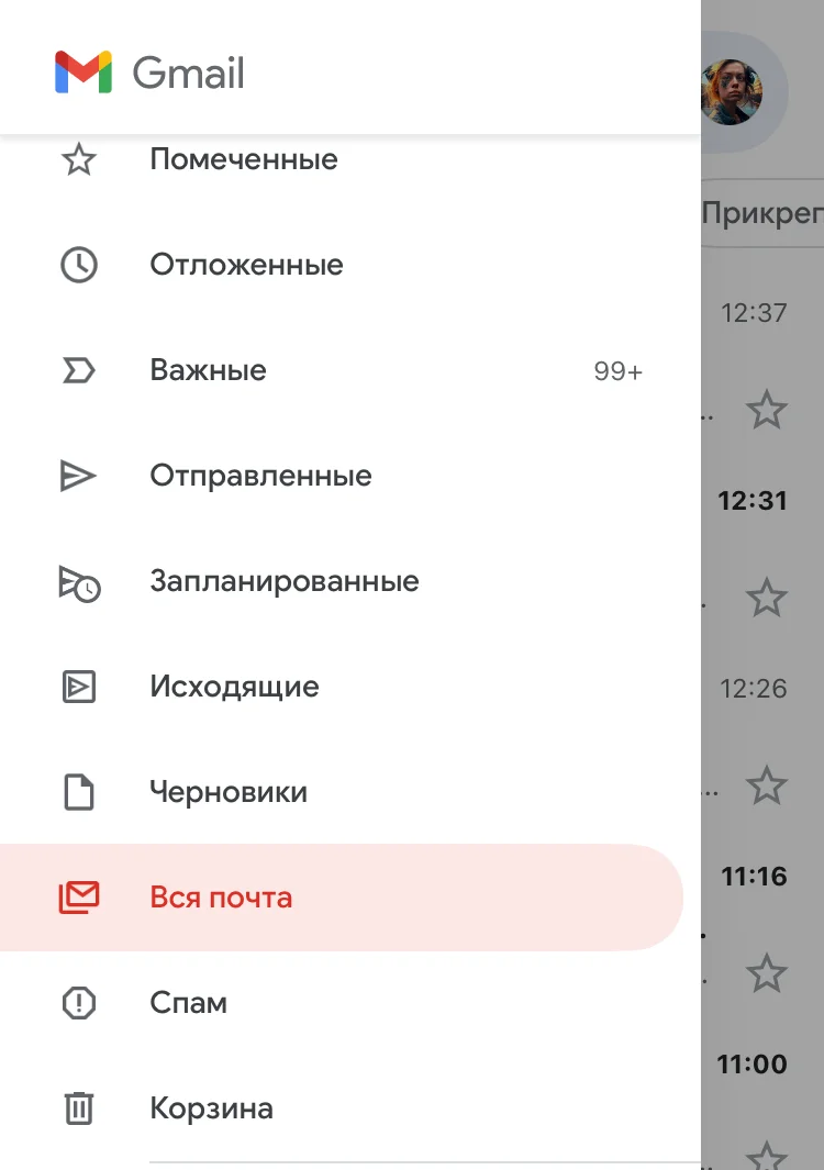 Также можно открыть папку «Вся почта» и найти нужное письмо вручную: откройте почтовый ящик Gmail на мобильном устройстве → в левом верхнем углу нажмите на значок «гамбургер» (три параллельных линии) → выберите «Вся почта».