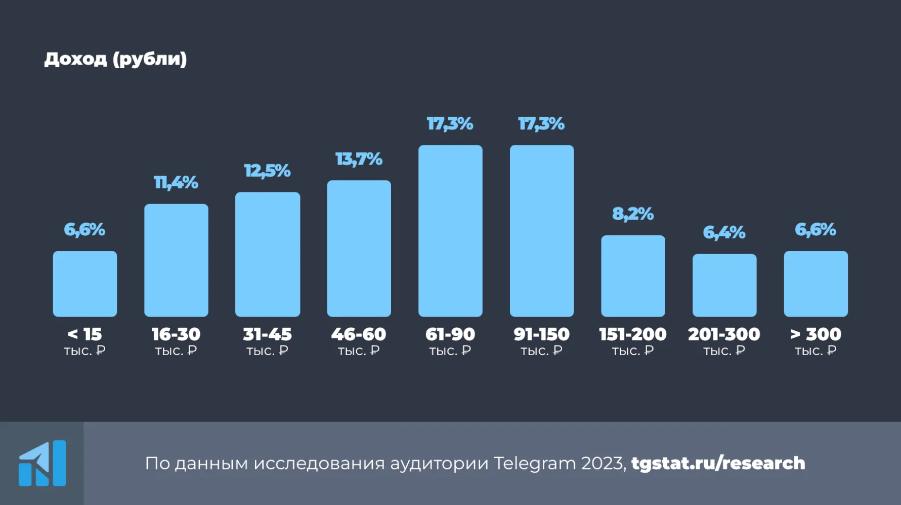 Треть пользователей зарабатывают от 61 000 до 150 000 рублей в месяц, 21% опрошенных зарабатывают больше 150 000 рублей, а 6,6% — больше 300 000 рублей в месяц. Еще 17% приходится на безработных.