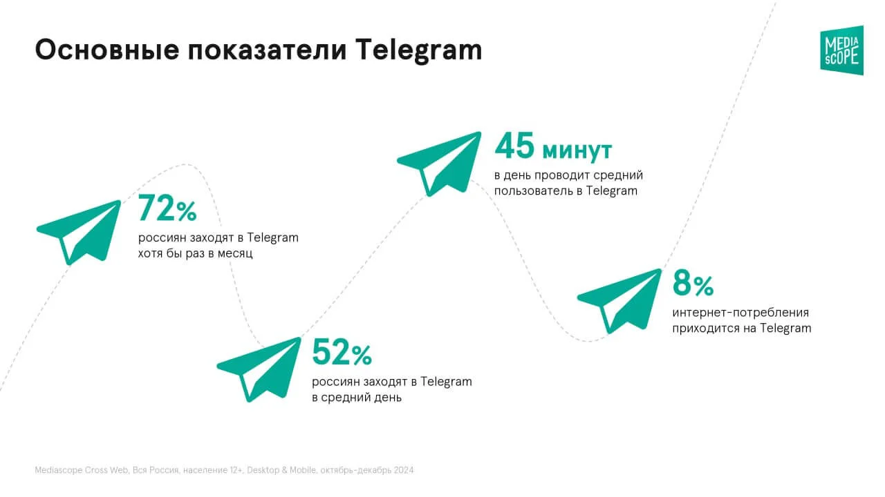 В январе 2025 года агентство Mediascope выяснило, что в декабре 2024 года мессенджер стал третьим по популярности интернет-ресурсом в России по среднесуточному охвату. В среднем в сутки мессенджер используют 52% интернет-пользователей России, или 67 млн человек. Также в Telegram вырос среднемесячный охват: в 4 квартале 2024 года составил 72% (в 2023 году был 68%).