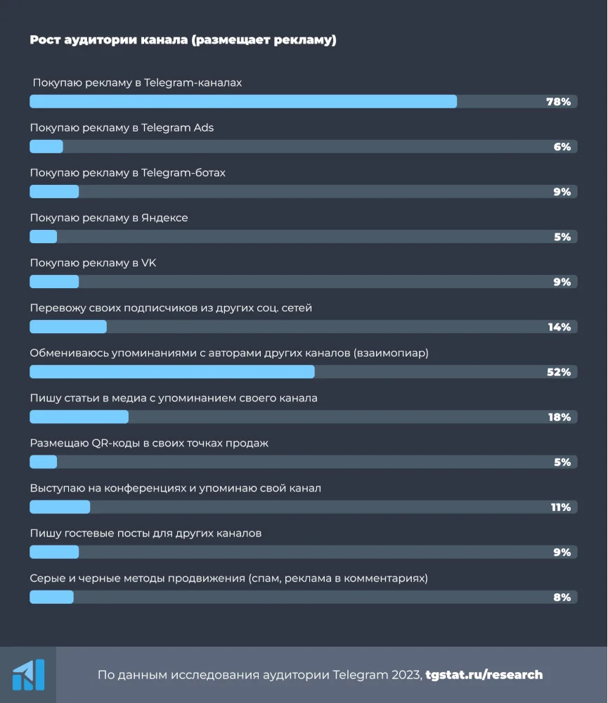 Методов много, но самые популярные из них — реклама в Telegram-каналах, взаимопиар, перелив аудитории из других социальных сетей, гостевые статьи и реклама через Telegram Ads.