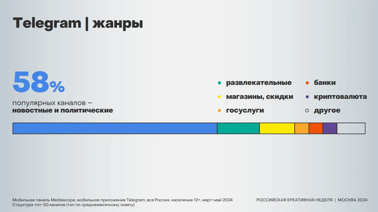 Не изменились и интересы: большая часть пользователей по-прежнему читает новостные каналы и посты о политике — по данным Mediascope это 58% популярных каналов. Однако у молодой аудитории от 12 до 24 лет в топ-5 самых популярных каналов вошли канал «Леонардо Дайвинчик», два канала стримера MELLSTROY и канал криптовалютной игры Hamster Kombat Announcement.