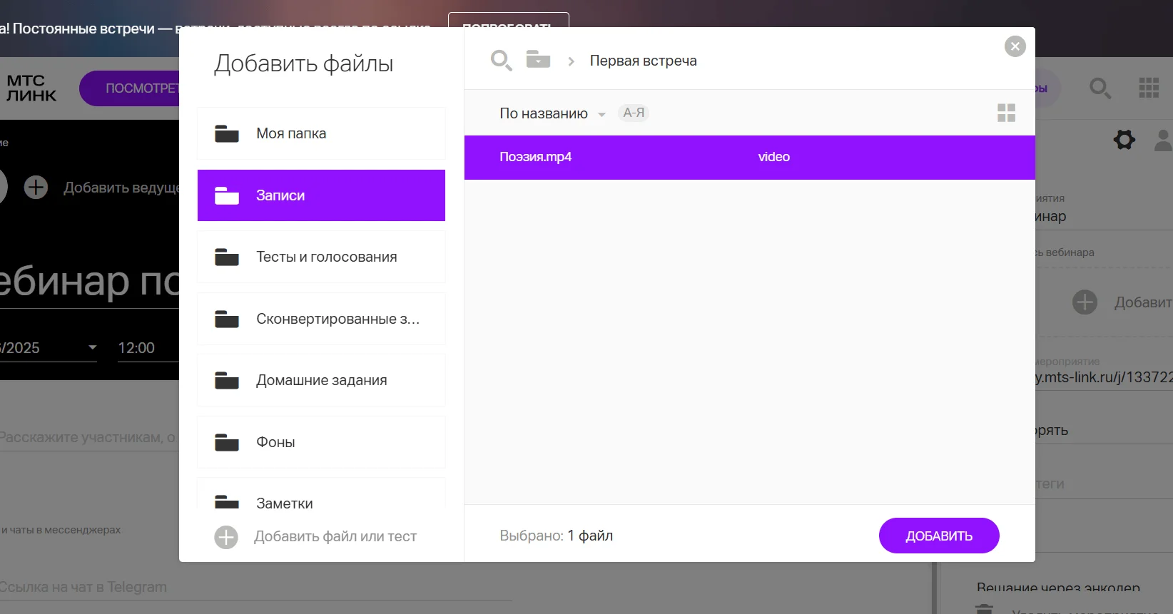 В открывшемся окошке можно загрузить не только видео, но и другие материалы для будущего автовебинара — например, фон, тесты и голосования, домашнее задание. Если до этого вы уже проводили живой вебинар на платформе МТС Линк, система предложит использовать старые материалы. Если вы пользуетесь сервисом впервые, все файлы можно загрузить напрямую с компьютера.