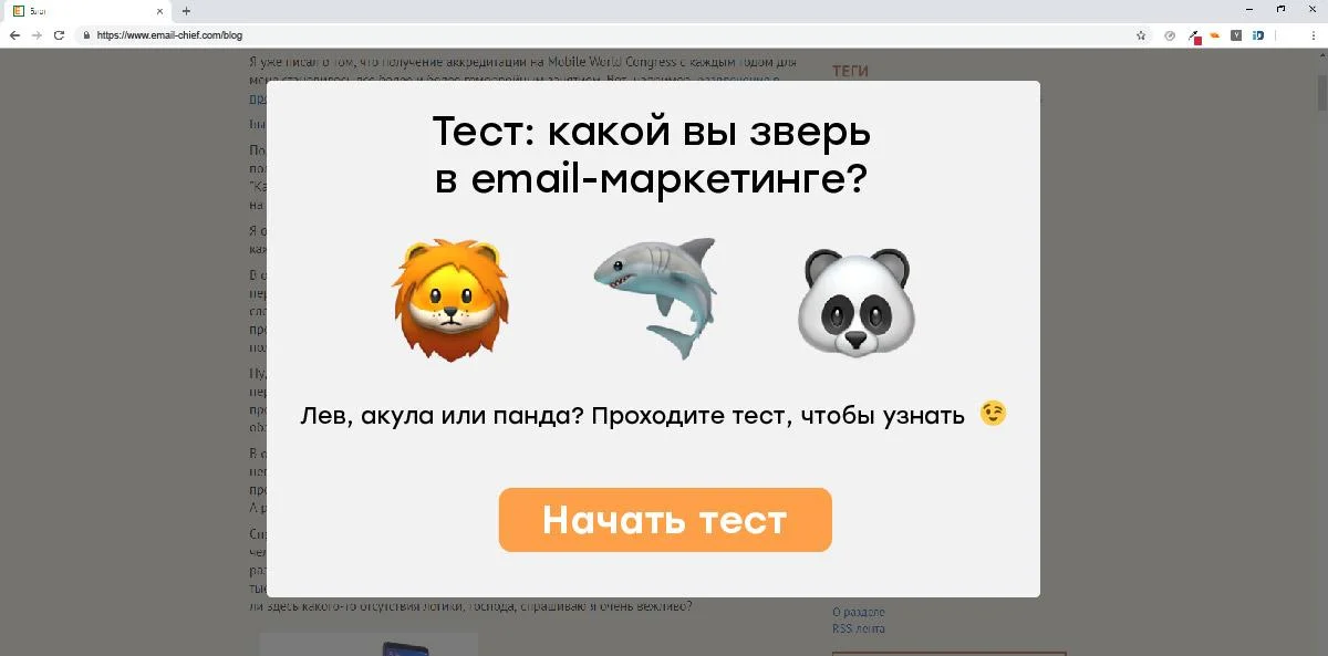 У Пети проблема: часть рассылки загремела в спам. Он поинтересовался у Google, почему это произошло. Поисковик услужливо кинул его на сайт «Email-шефа». Пока он читает нужную статью, вылетает попап: