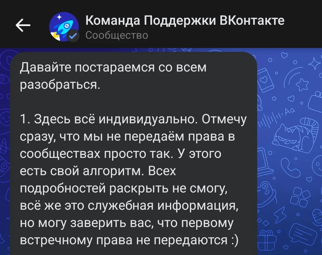 Специалист техподдержки также заверил, что у создателя паблика права не отбирают. В случае нарушений, сообщество могут заблокировать, но создатель сообщества все равно останется его единственным владельцем.