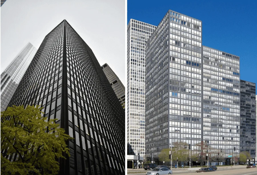 В американском контексте идеи Баухауса получили развитие в работах Людвига Мис ван дер Роэ. Его здания, такие как Сигрэм-билдинг в Нью-Йорке или жилые дома на Лейк-Шор Драйв в Чикаго, строятся на тех же принципах: строгая геометрия, стекло и металл, отсутствие декора и ясная структура.