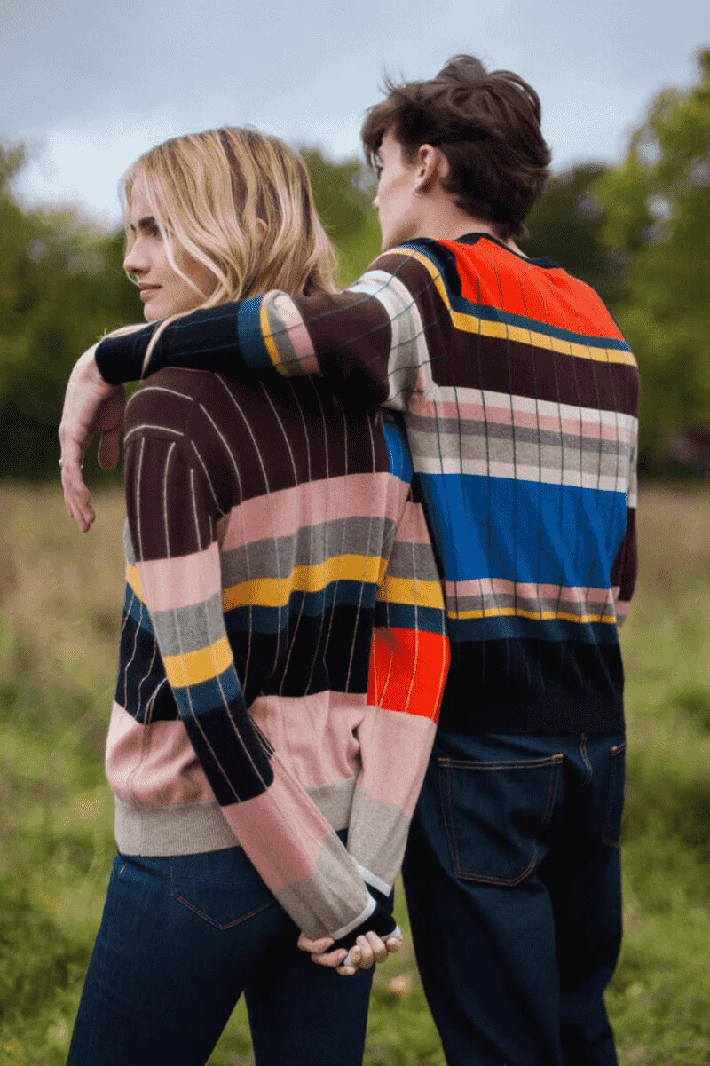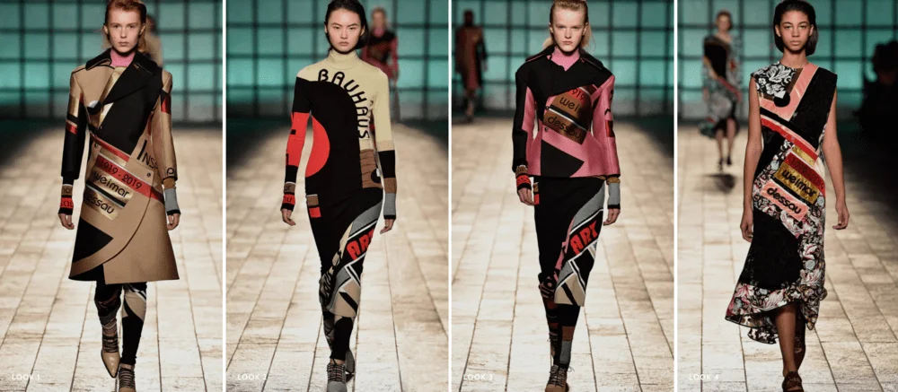 Но есть и прямые визуальные отсылки к эстетике Баухауса: геометрические формы, контрастные цветовые блоки, ограниченные палитры и архитектурные силуэты. В коллекциях Ив Сен-Лоран это влияние особенно хорошо видно в оммаже Питу Мондриану 1965 года — с чёткой геометрией и цветными блоками. Пол Смит регулярно обращается к текстильным работам Анни Альберс, а в зимней коллекции 2018 года Мэри Катранзу напрямую работала с графикой и орнаментами, вдохновлёнными наследием Баухауса.