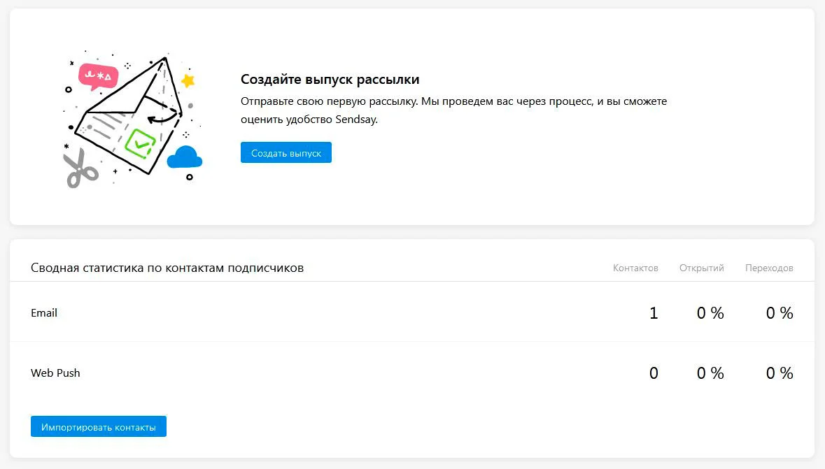 Sendsay — сервис, который позволяет собирать подробную информацию о клиентах и выстраивать многоканальное взаимодействие с аудиторией. Работа сервиса ведётся в четырёх направлениях — повышение продаж, омниканальное взаимодействие, создание персонализированных рассылок и отправка больших объемов массовых и транзакционных писем. Рассылать письма можно по email, web push, mobile push, SMS, Telegram, VK.