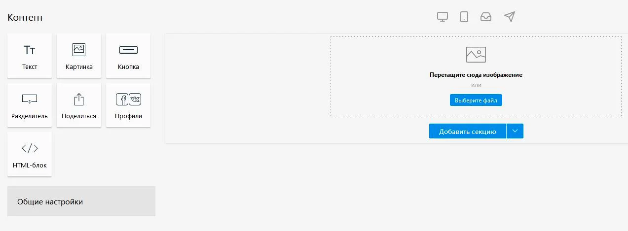 У редактора писем дружелюбный интерфейс с небольшим количеством стандартных блоков.