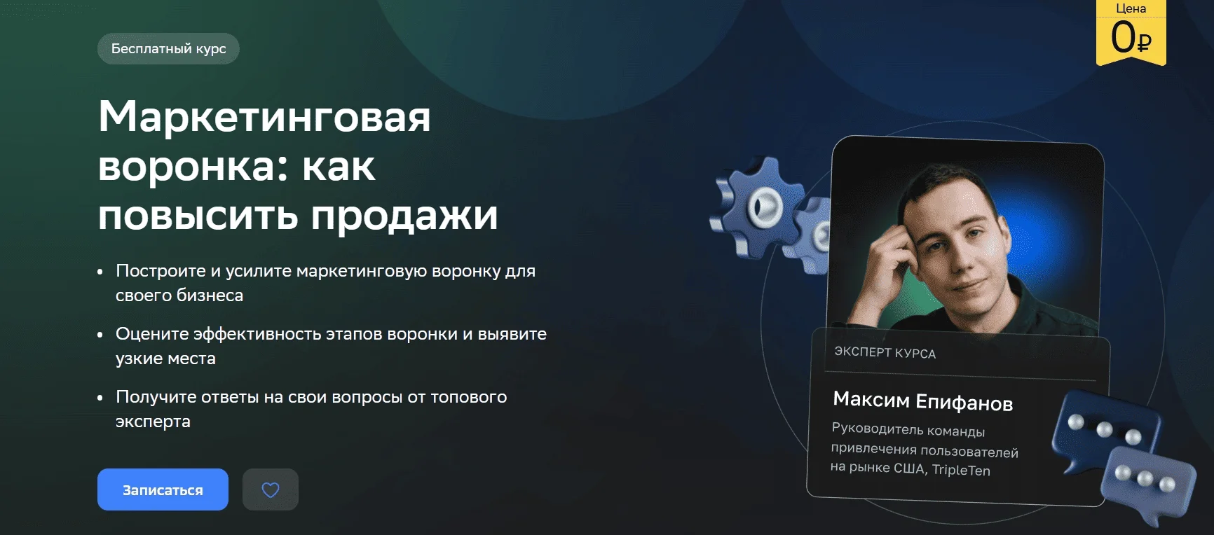 Чему учат: курс посвящён конкретному маркетинговому инструменту — воронке продаж. В видео рассказывают, как её построить и использовать на практике. Отдельный блок отведён под анализ ресурсов для работы воронки, есть примеры работающих воронок.