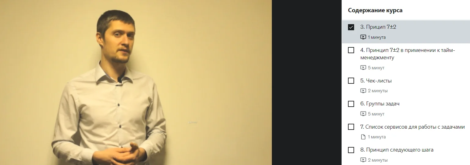 Чему учат. Курс содержит набор рабочих приёмов тайм-менеджмента. Всего в нём 11 тем: