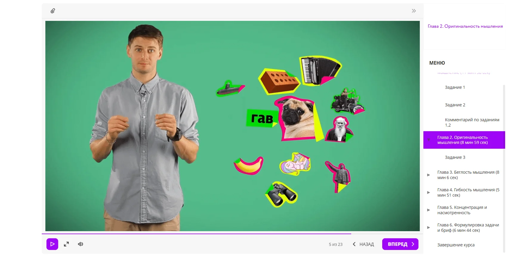 Чему учат. В курсе собраны принципы и методы развития креативности и нестандартного мышления. Всего студентов ждут 6 уроков: