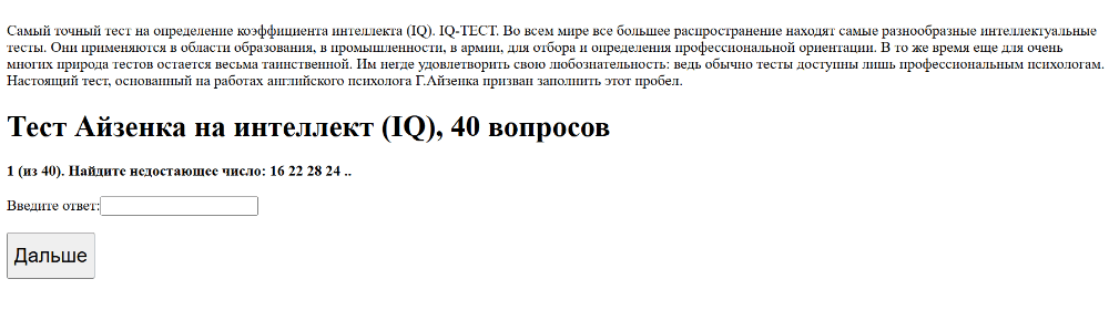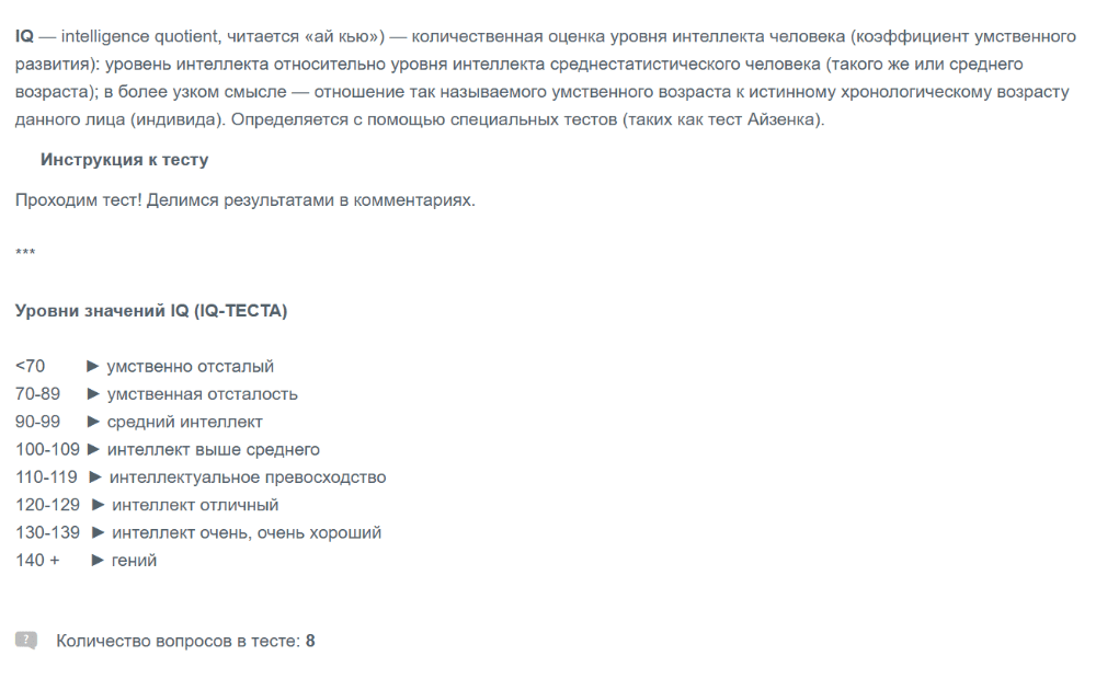 Тест Айзенка. Измеряет логическое и абстрактное мышление, вербальные способности, счёт и пространственное восприятие. Это один из самых популярных подходов к оценке IQ. Чтобы получить достоверный результат, желательно соблюдать ограничение по времени — обычно около 30 минут.