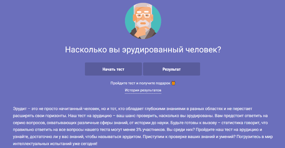 Тест «Насколько вы эрудированный человек?» от «Тестометрики». Включает 20 вопросов на темы из истории, литературы, географии, химии, биологии и прочим предметам. Можно просматривать историю результатов при повторном прохождении.