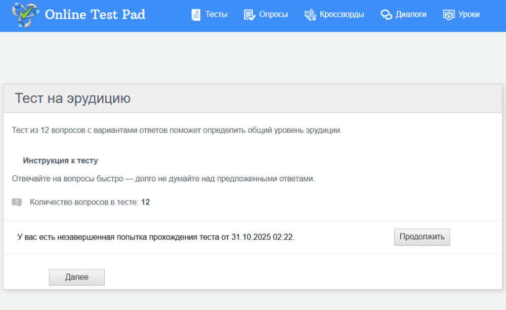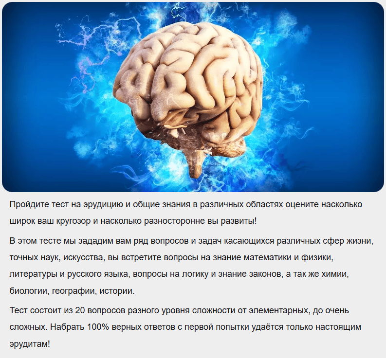 Тест на эрудицию на Online Test Pad. Проверяет комплексные знания, охватывающие историю, искусство, географию, науку и иные сферы. Ответ отображается в количестве верных ответов и в процентах. Чтобы сохранить результат, можно отправить его на email.