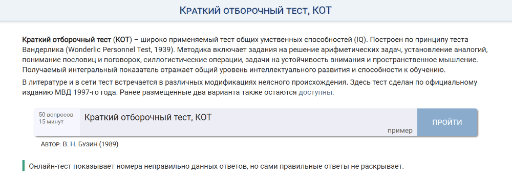 Краткий отборочный тест (КОТ). Измеряет интегральный показатель общих способностей, включая числовые, вербальные и логические задачи. Это один из самых популярных тестов для оценки общего интеллекта. Он состоит из 50 вопросов и строго ограничен по времени (около 15 минут), что позволяет оценить не только точность, но и скорость мышления.
