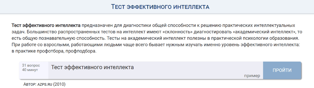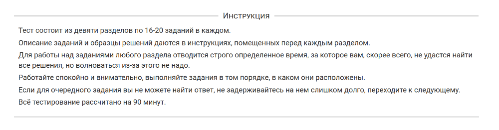 Тест эффективного интеллекта. Оценивает общую способность к решению практических интеллектуальных задач. Важное условие теста — все промежуточные действия выполнять в уме, без черновиков и калькулятора.