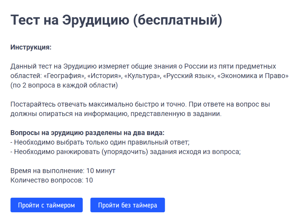 Тест на эрудицию по знаниям о России. Содержит вопросы по географии, истории, культуре, русскому языку, праву. Время на прохождение ограничено в 10 минут. Можно использовать таймер.