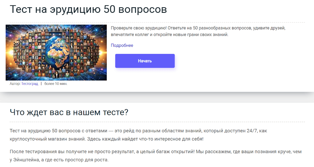 Тест на эрудицию 50 вопросов. Охватывает различные области знаний — историю, астрономию, литературу, точные и гуманитарные науки. По завершении можно посмотреть свои ответы и правильные варианты.