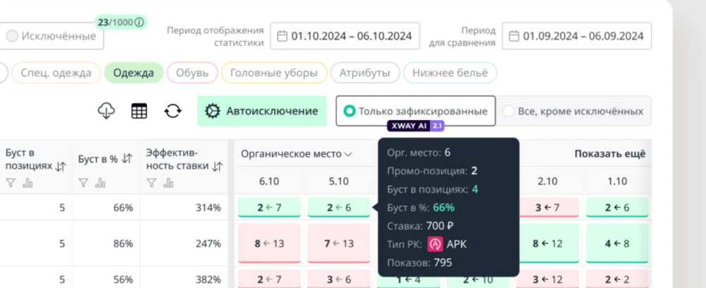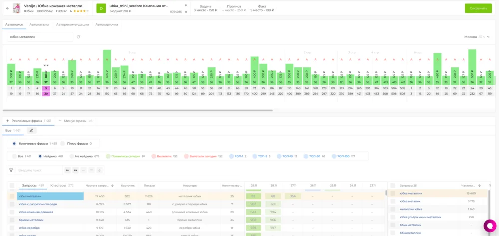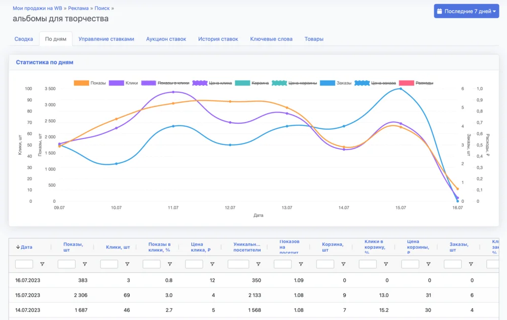 Marpla — это сервис для комплексной работы с Wildberries. Помимо биддера, здесь есть функционал для мониторинга позиций, анализа ключевых запросов и оптимизации карточек. Платформа активно развивает образовательное направление: у сервиса есть собственная «школа селлеров» и комьюнити для обмена опытом. Бесплатного тарифа нет, но доступен пробный период, чтобы протестировать все возможности системы.