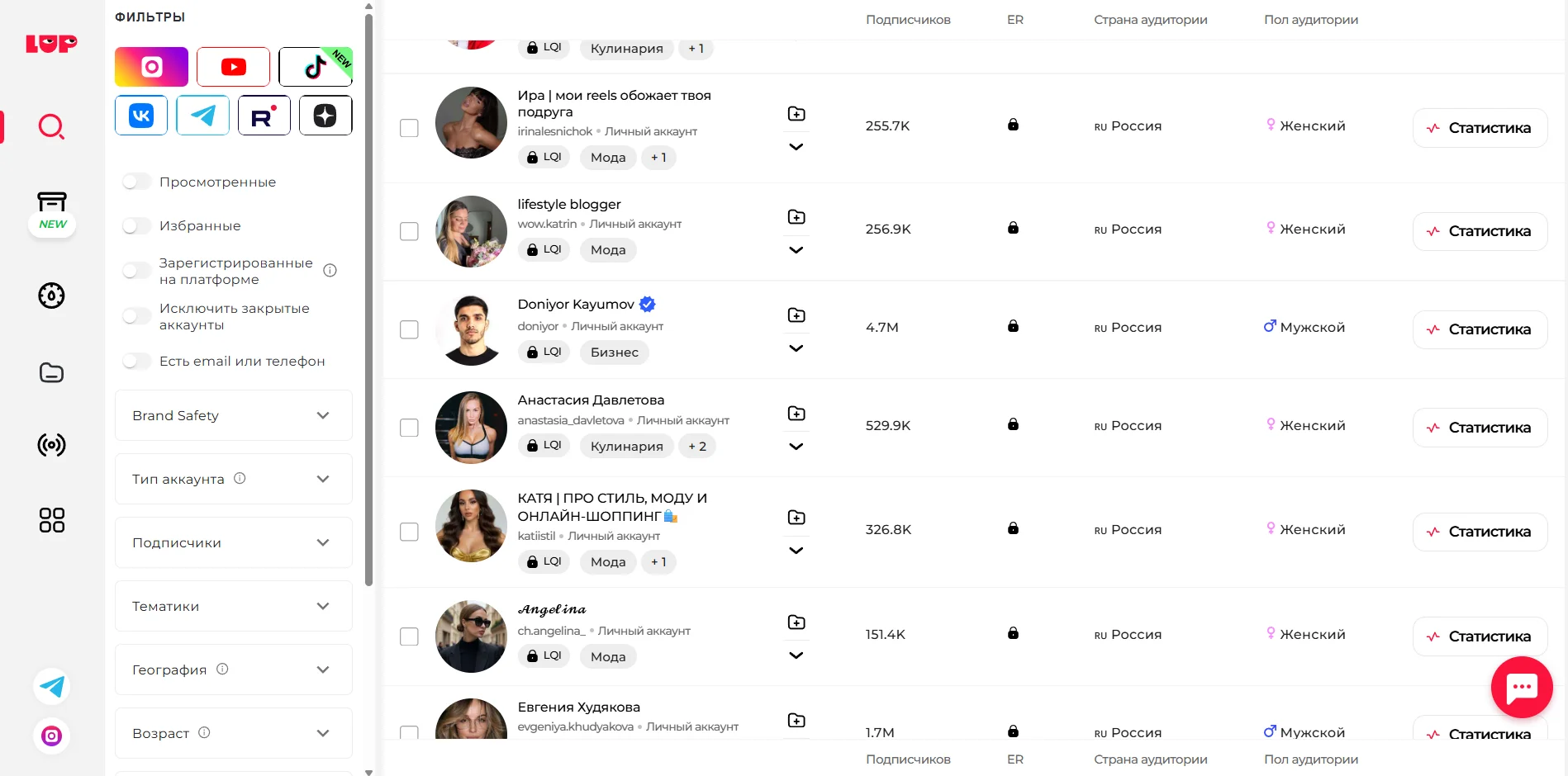 Есть возможность фильтровать все аккаунты по нужным соцсетям. Для более точных настроек потребуется тариф PRO.