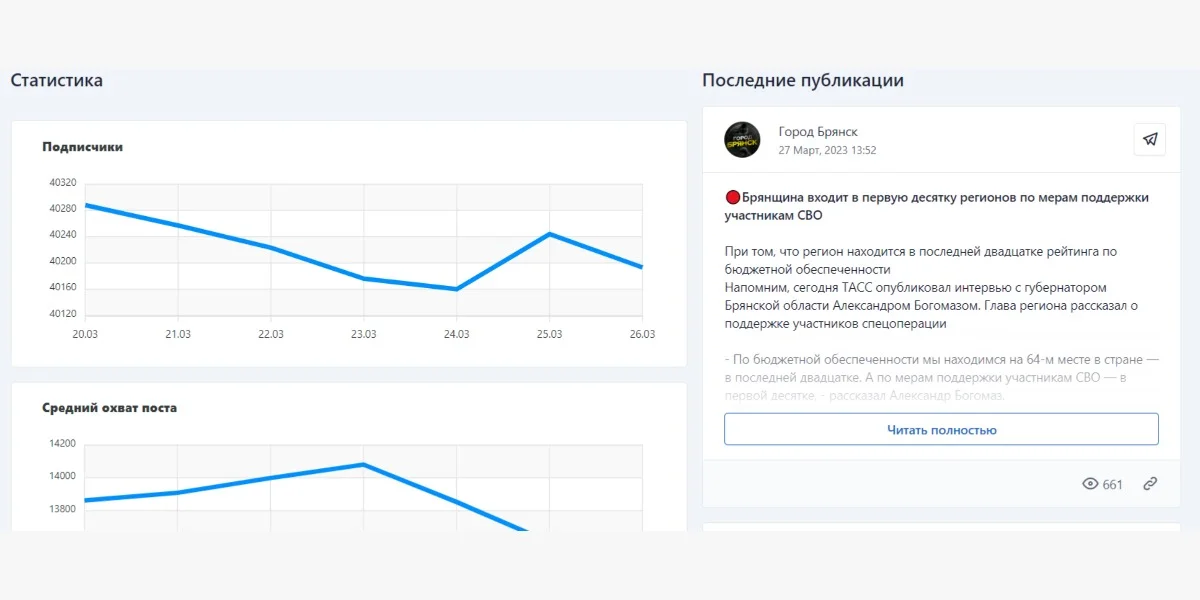 Какую статистику можно посмотреть. Можно проверить статистику по подписчикам и их изменение за месяц, охват, ERR, среднее количество просмотров на каждую публикацию и сколько публикаций в сутки постит канал.