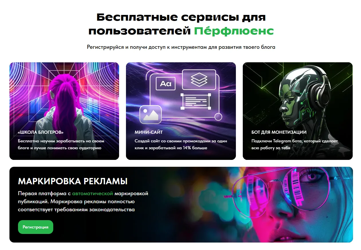 У платформы есть бесплатная Школа Блогеров, где научат развивать свой блог. Также у сервиса есть Telegram-бот для запуска конкурсов с защитой от накрутки и шэрингом промокодов для монетизации. Через платформу можно создать свой мини-сайт с промокодами.