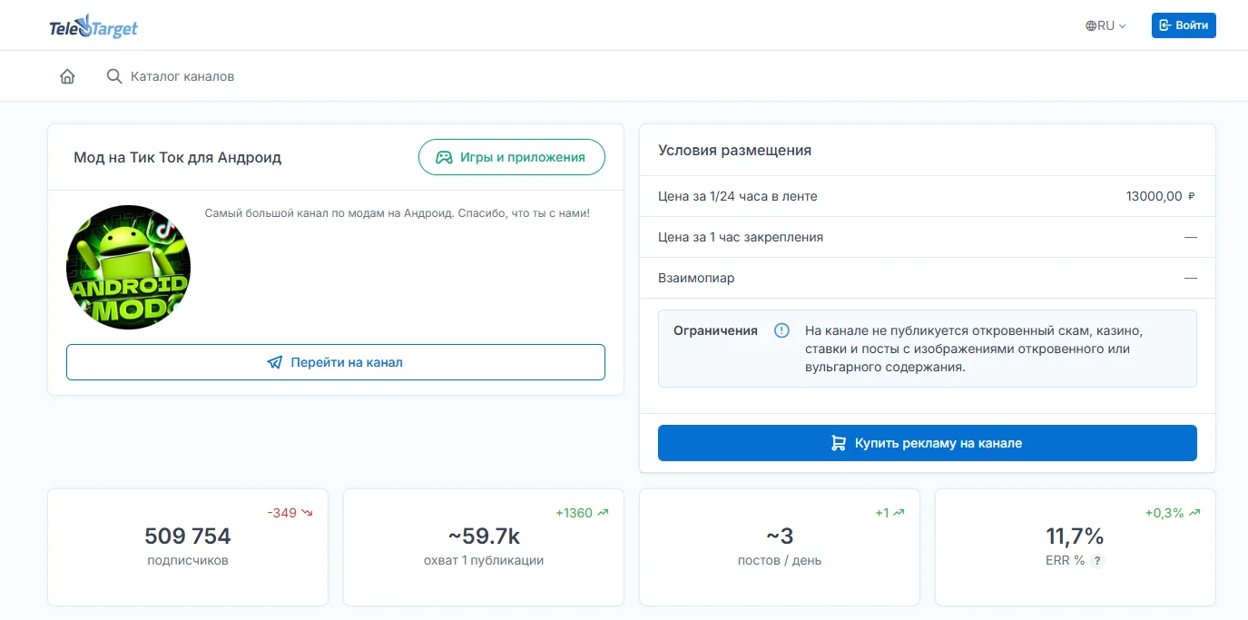 На странице канала можно посмотреть стоимость рекламы, увидеть ограничения (если канал готов публиковать рекламу не на все тематики), общую статистику по каналу и дополнительные условия, если они есть.