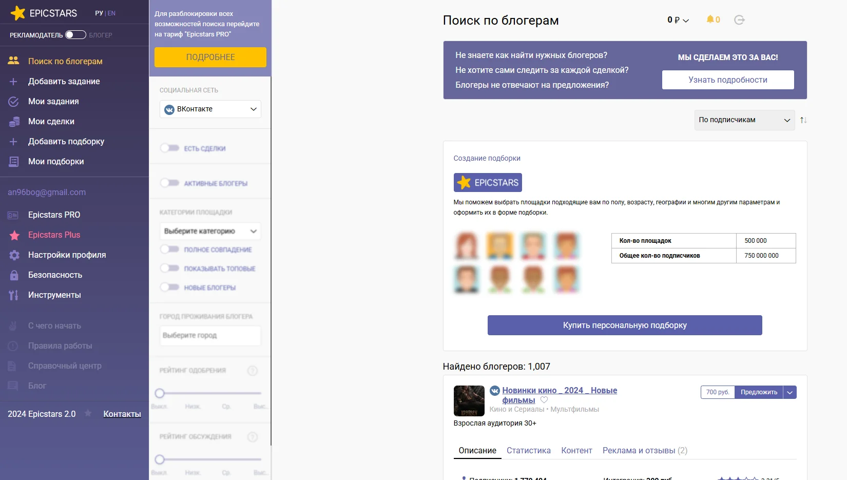 При подключении PRO можно настроить поиск только по блогерам, с которыми уже работали рекламодатели.