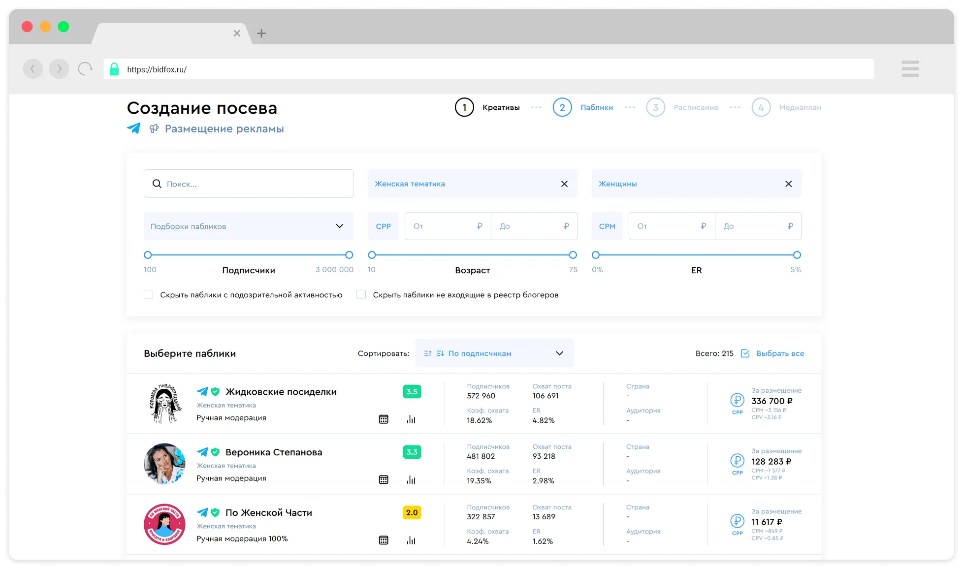 Также доступен формат Full-service: специалисты BidFox берут на себя настройку посевов и контроль выхода рекламных постов.