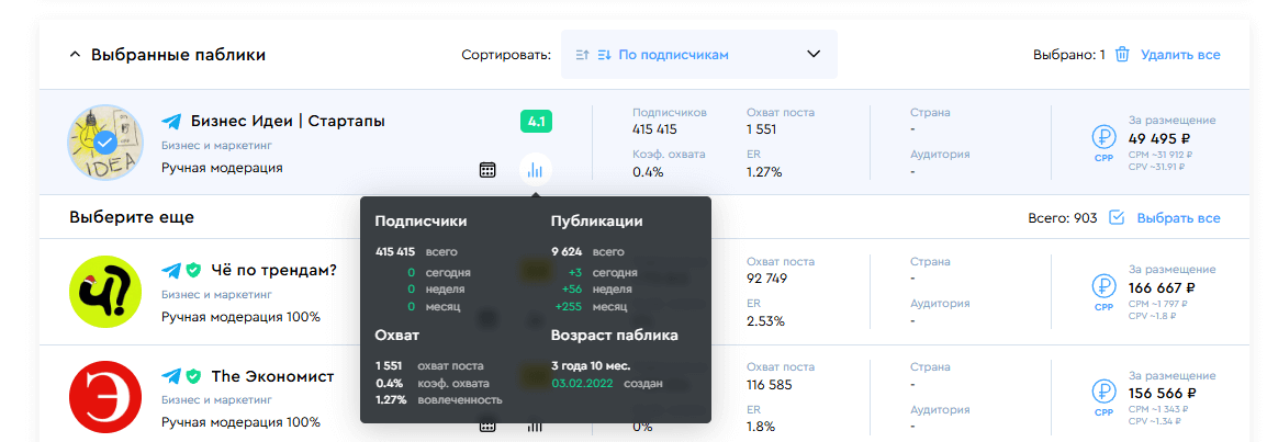 Все каналы можно фильтровать по подписчикам, охватам, ERR, стоимости рекламы, времени размещения в топе, периоду удаления из канала.
