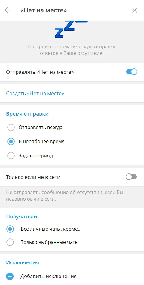 В настройках можно исключить из списка получателей отдельные чаты или целые категории чатов. Для сообщения «Нет на месте» можно выбрать условия отправки. Например, только если бизнес-аккаунт давно не в сети или в определённый период.