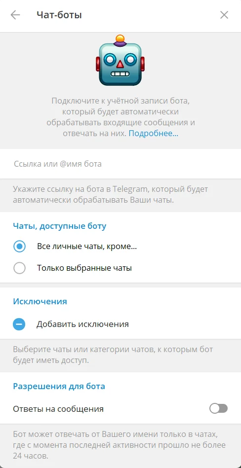 При подключении бота можно выбрать, к каким чатам он получит доступ. Например, выбрать определённые чаты или добавить в исключения всех пользователей из списка контактов.