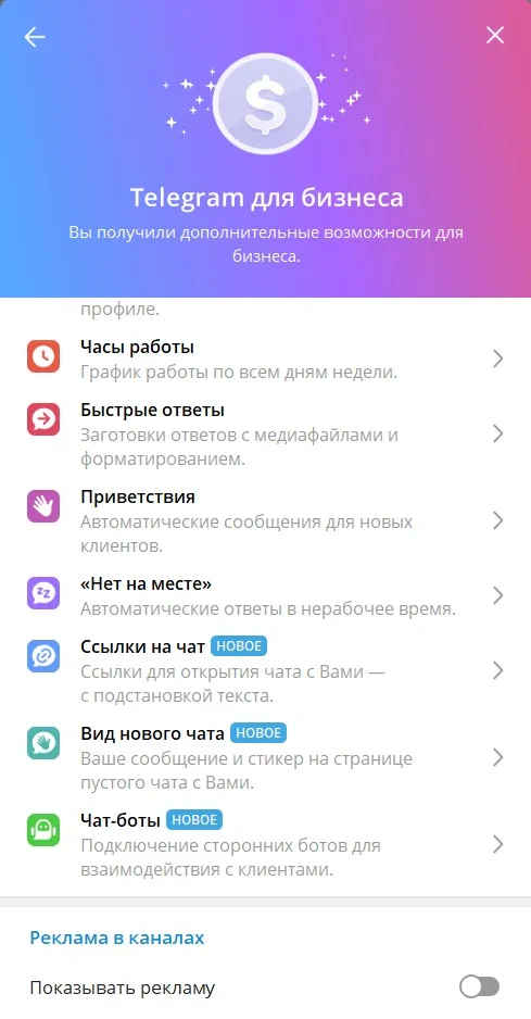 Пока бизнес-аккаунты доступны только пользователям с подпиской Premium. Они могут использовать функции бесплатно, ничего подключать дополнительно не нужно. Premium стоит 299 ₽ в месяц или 1990 ₽ в год. В отдельной статье мы подробно рассказываем про Premium-подписку Telegram.