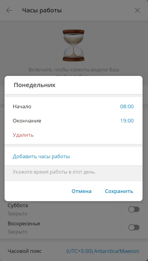 Компания в аккаунте может указать свой график работы. Например, 5 дней в неделю с 8:00 до 20:00. Клиенту остается зайти в профиль и узнать, в какие часы открыт офис/магазин или когда ему ждать ответ на сообщение.